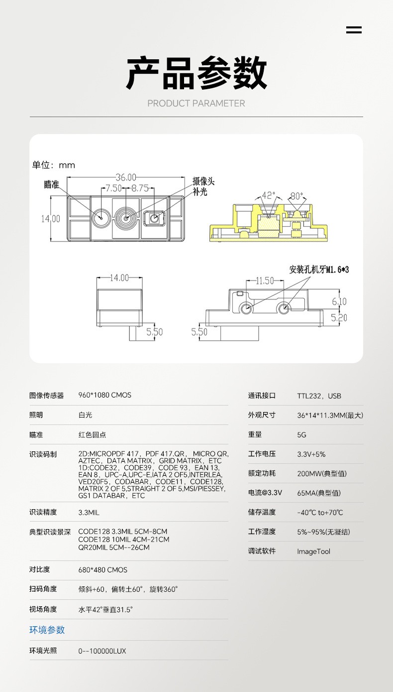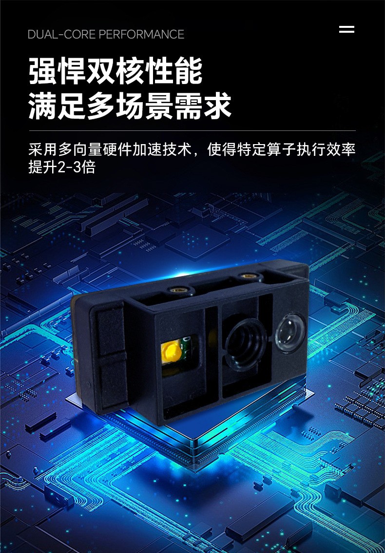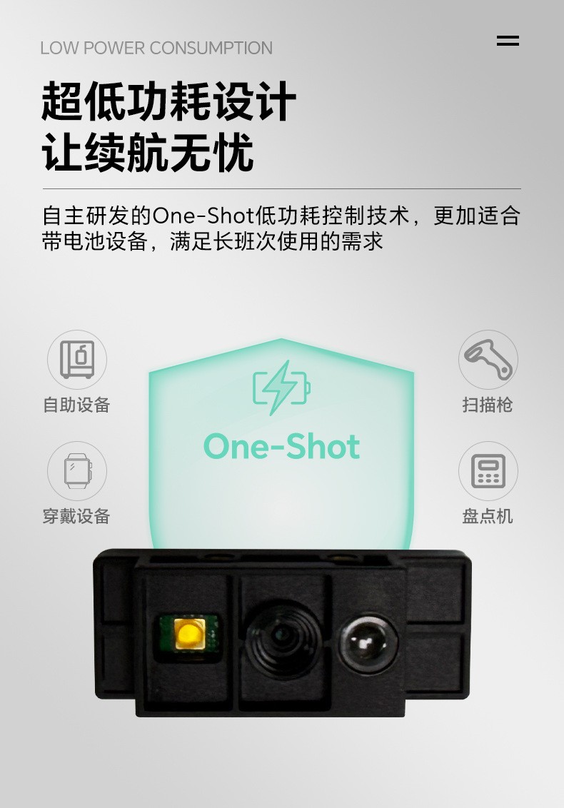⼀体式条码识别引擎,采⽤双核⾼性能主控,⾏业⾸款集成⾃主研发的异构多向量加速技术和独有的低功耗One-Shot控制技术,是满⾜复杂苛刻场景下⾼可靠条码识别⽅案的最佳性价⽐之选;
