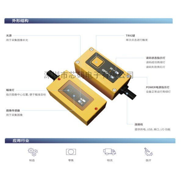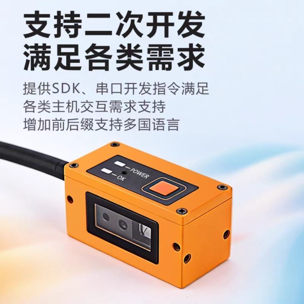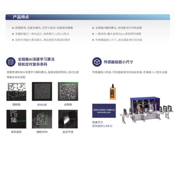 即插即用,无复杂操作,无学习成本,安装调试便捷 丰富的接口一体化设计,支持串口、USB 以及IO 定制专用超大景深镜头,满足超宽范围读码需求 全链路AI解码算法,支持复杂DPM码读取 一图多码,最大支持30psc条码同时读取 传感器级超小尺寸,适应超紧凑空间安装